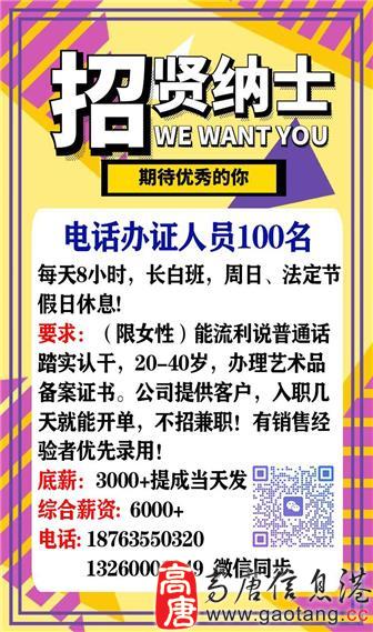 要求:能流利说普通话,踏实认干,20-40岁,办理艺术品备案证书。公司提供客户,入职几天就能开单,不招兼职!有销售经验者优先录用(限女性)。
