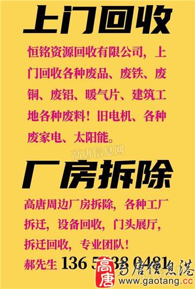 恒铭资源回收有限公司,上门回收各种废品、废铁、废铜、废铝、暖气片 建筑工地各种废料!旧电机、各种废家电、太阳能