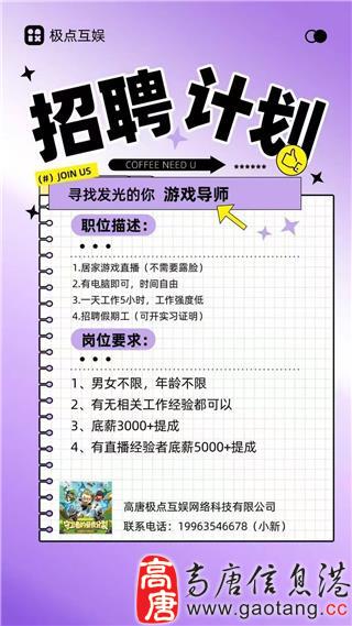 - 3000-6000元/招聘手游主播,男女不限,年龄不限