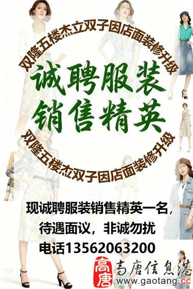 双隆五楼杰立双子因店面装修升级,现诚聘服装销售精英一名,待遇面议,非诚勿扰。半天班