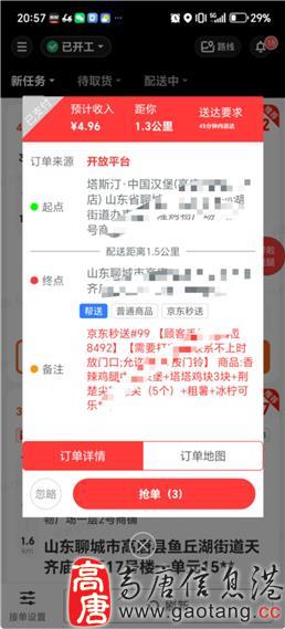 公司简介:帮拉跑腿是做跑腿服务的。跑一单赚一单,工资日结,最低4元。最高上不封顶。长期招聘,长期有效。到了,骑手刚刚入住高唐县一片净土,任你跑单,你来的早,跑的就多。时间自由。上线就接单,下线就下班。