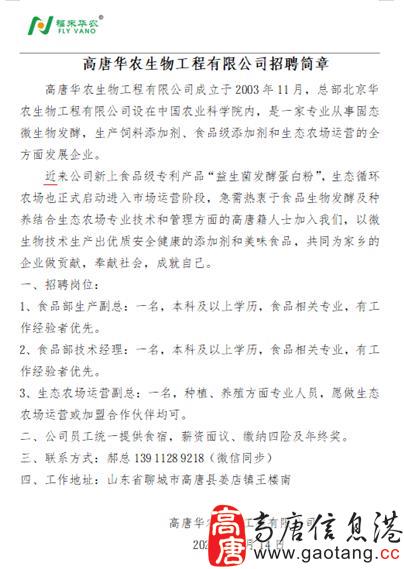 - 高唐食品公司招聘化验员、文员、会计、业务经理、电工、维修工、男女普工数名