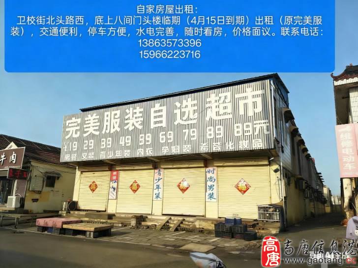 出租房屋介绍:卫校街北头路西,底上八间门头楼临期(4月15日到期)出租(原完美服装),交通便利,停车方便,水电完善,随时看房,价格面议。联系电话: