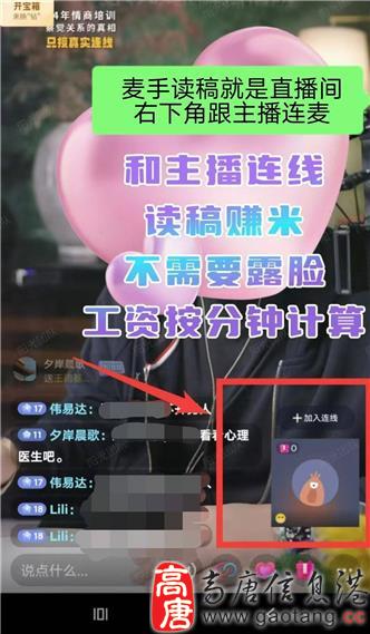 - 兼职/6000元/在直播间和主播连麦读稿