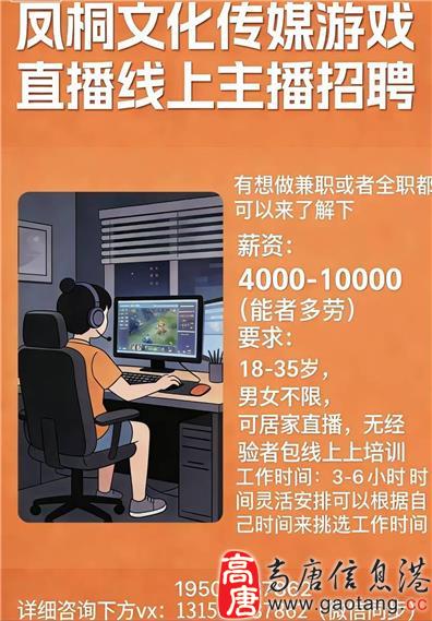 凤桐文化传媒招游戏直播线上主播啦!
