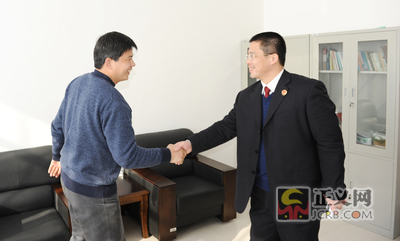 党组书记、代检察长贾金坤(左)与干警亲切握手