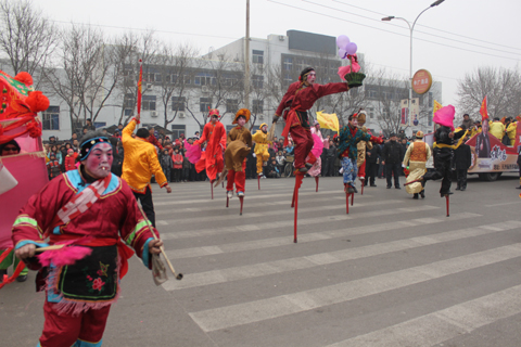 旱船、踩高跷、扭秧歌、二鬼摔跤、扇绸舞等精彩的精彩表演展示了老百姓迎接新春的精气神,给元宵佳节增添了无限乐趣。嘴里叼着烟斗的老太太、赶着毛驴的庄稼人、步履滑稽的老大爷……令人忍俊不禁、喜笑颜开。打扮得花枝招展的媒婆更是别有一番看头,她三步一扭二步一跨,向俏皮喧哗的孩子们一阵狂扭,夸张自如的表演引得人们捧腹大笑。