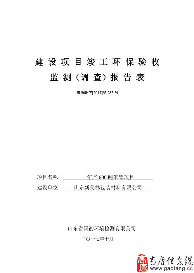 山东新美林包装材料有限公司于2017年6月委托山东优纳特环境科技有限公司编制完成了《山东新美林包装材料有限公司年产600吨纸管项目环境影响报告表》,2017年7月19日高唐县环境保护局以高环报告表 [2017]81号文对该项目进行了批复。