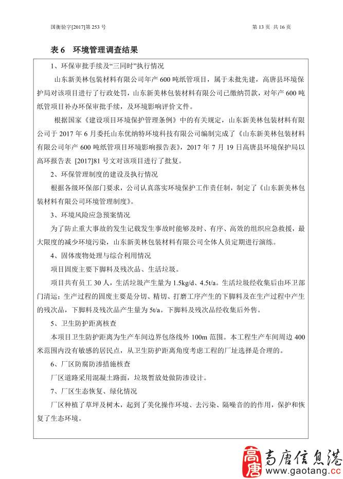 本次验收为年产600吨纸管项目验收,内容主要为:核查项目实际建设内容、对项目环境保护设施建设情况进行检查、对环境保护设施调试效果以及工程建设对环境的影响进行现场监测。