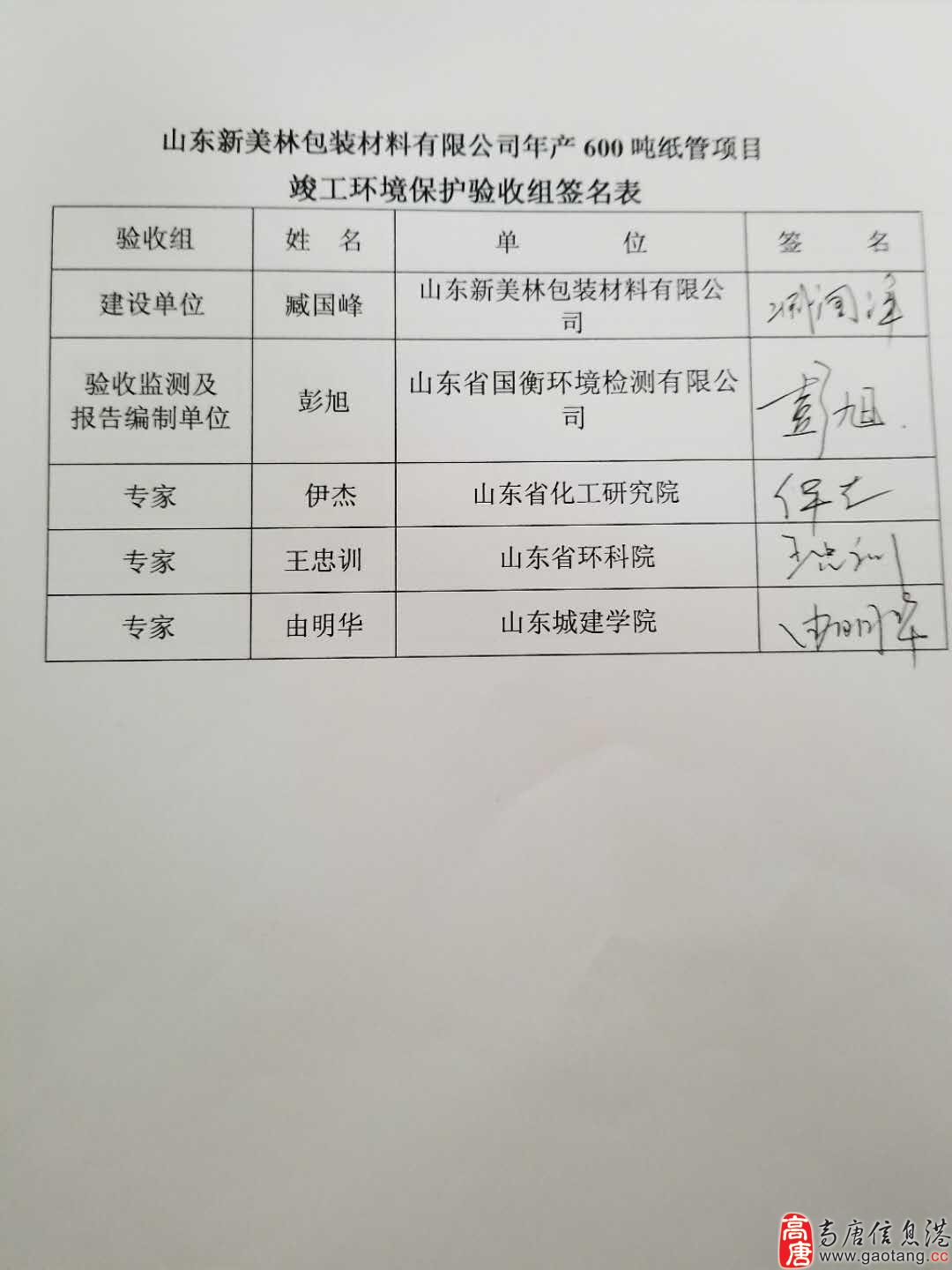 2018年1月30日,山东新美林包装材料有限公司在高唐组织召开了年产600吨纸管项目竣工环境保护验收现场会。参加会议的单位有环境影响报告表编制单位-山东优纳特环境科技有限公司、验收监测报告表编制单位-山东省国衡环境检测有限公司,特邀2位专家参加了会议。会议期间,由建设单位、环境影响报告表编制单位、验收监测报告表编制单位及特邀2位专家组成验收组(验收组名单附后)。验收组严格依照建设项目竣工环境保护验收有关规定,听取了建设单位对项目环境保护“三同时”制度落实情况的介绍,实地踏勘了建设项目现场,审阅核实了有关资料,经认真讨论,形成如下验收意见:
