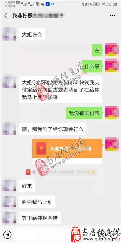 无独有偶,8月21日上午,高唐信息港网友反映,自己于8月8日也遇到了相类似的情况,网友为高唐的一位催乳师,被骗数额也不大,因未见过诈骗人,不知与昨日推文中的20岁女孩是否为同一人,网友对此非常气愤,虽然被骗钱财不多,但自己的一份热心反而成了这些诈骗人的“收入来源”,希望借此提醒其他市民多加留意,防止被骗。